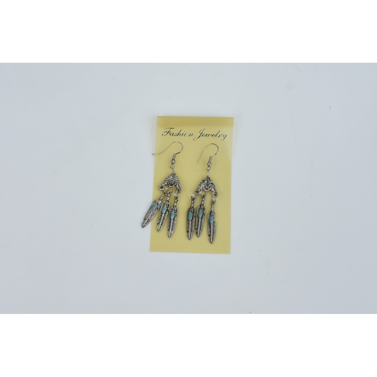 Par de brincos com penas em metal prateado e apontamentos azuis