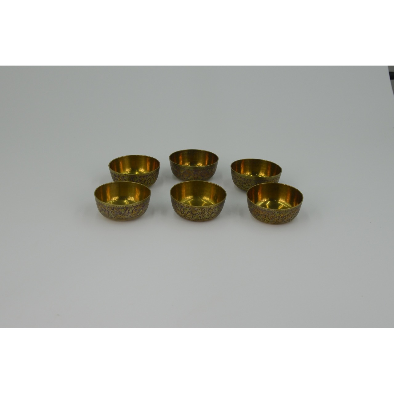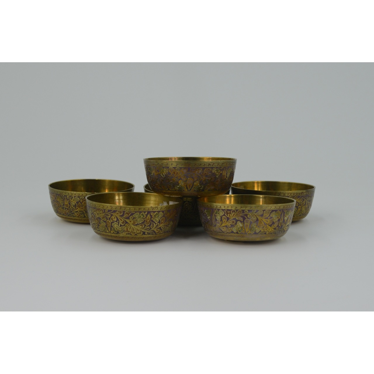 Conjunto de 4 taças orientais em latão indiano, decoradas com motivos vegetalistas gravados e pintados em tons policromos. Com a indicação "Made in India". (actualmente temos 4 taças. Podem ser vendidas à parte, preço sob consulta.)