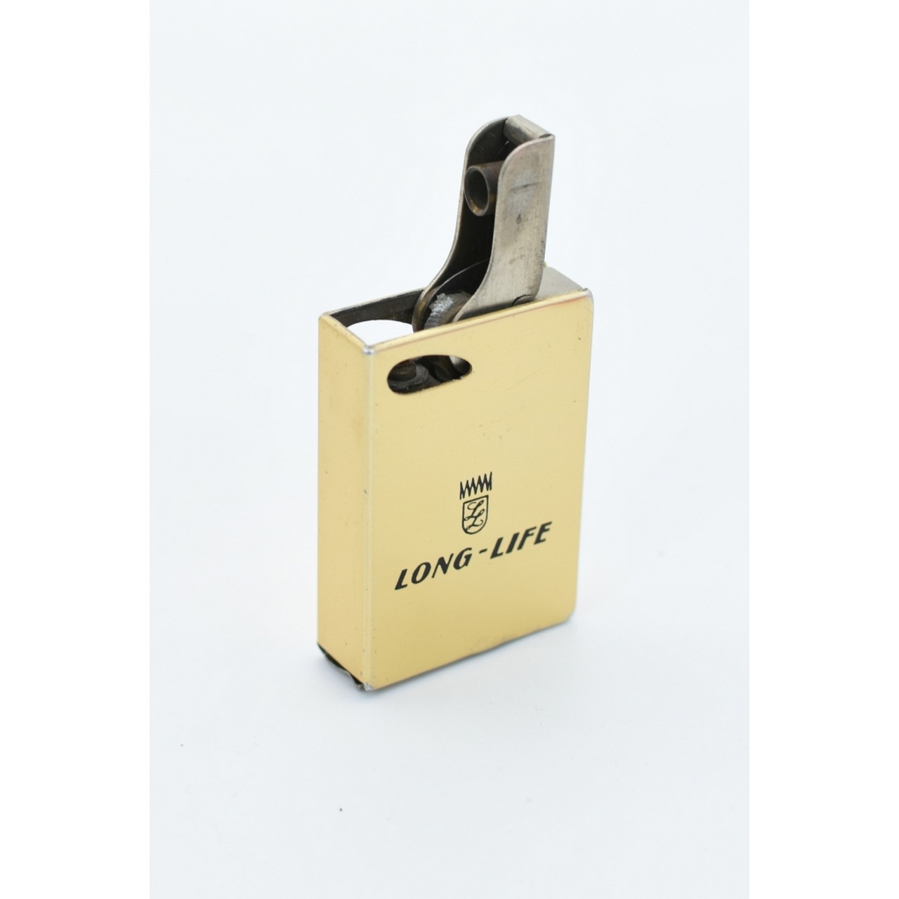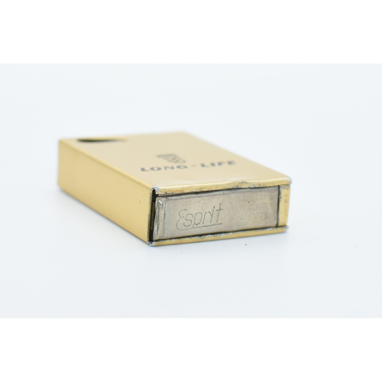 Isqueiro Esprit, West Germany, dourado, semi-automático. Em latão. Anos 50. Inscrição Long-Life. Tampa do depósito encravada. Falta pedra e querosene.