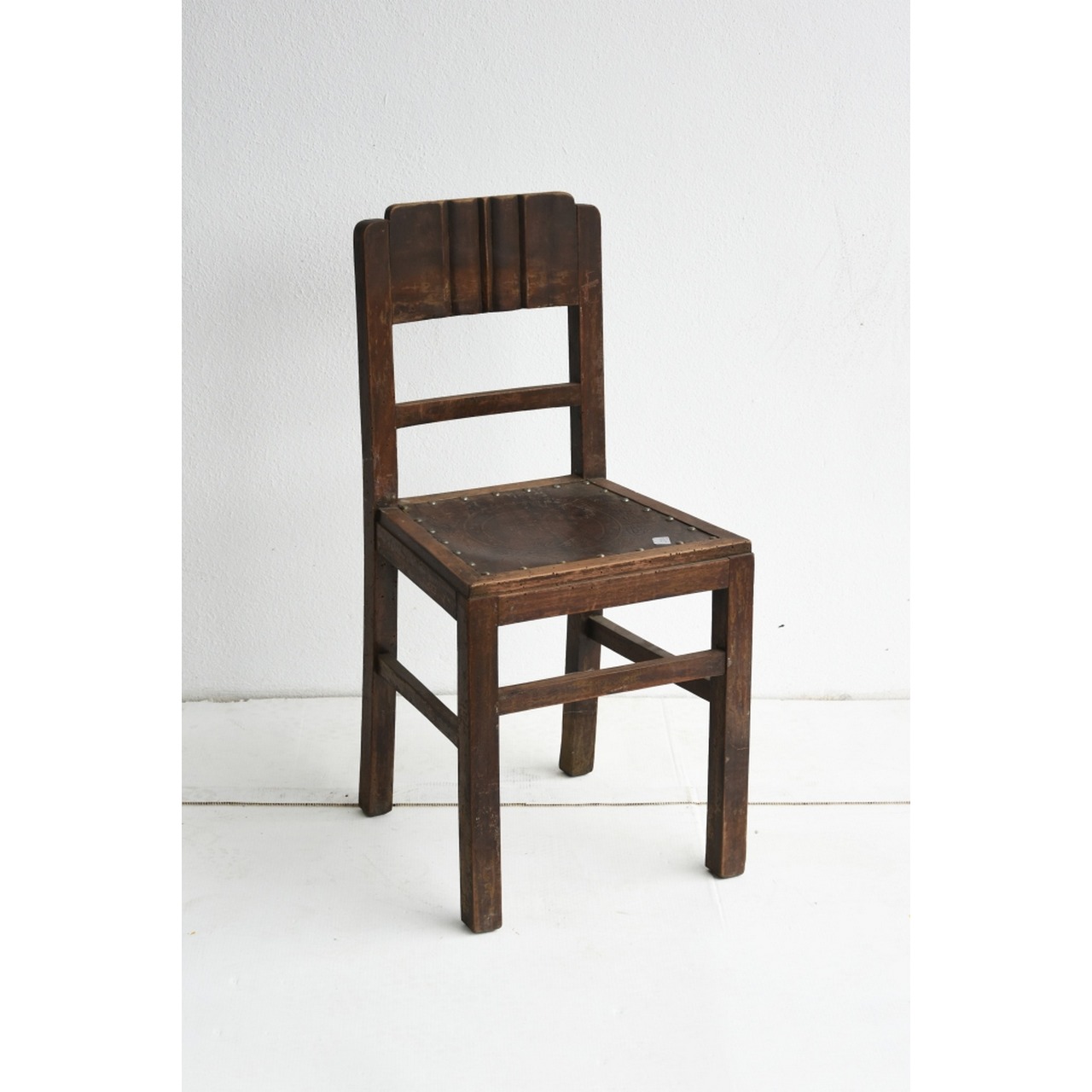 Cadeira antiga em madeira com assento em couro e pregaria. Possivelmente anos 40. Século XX