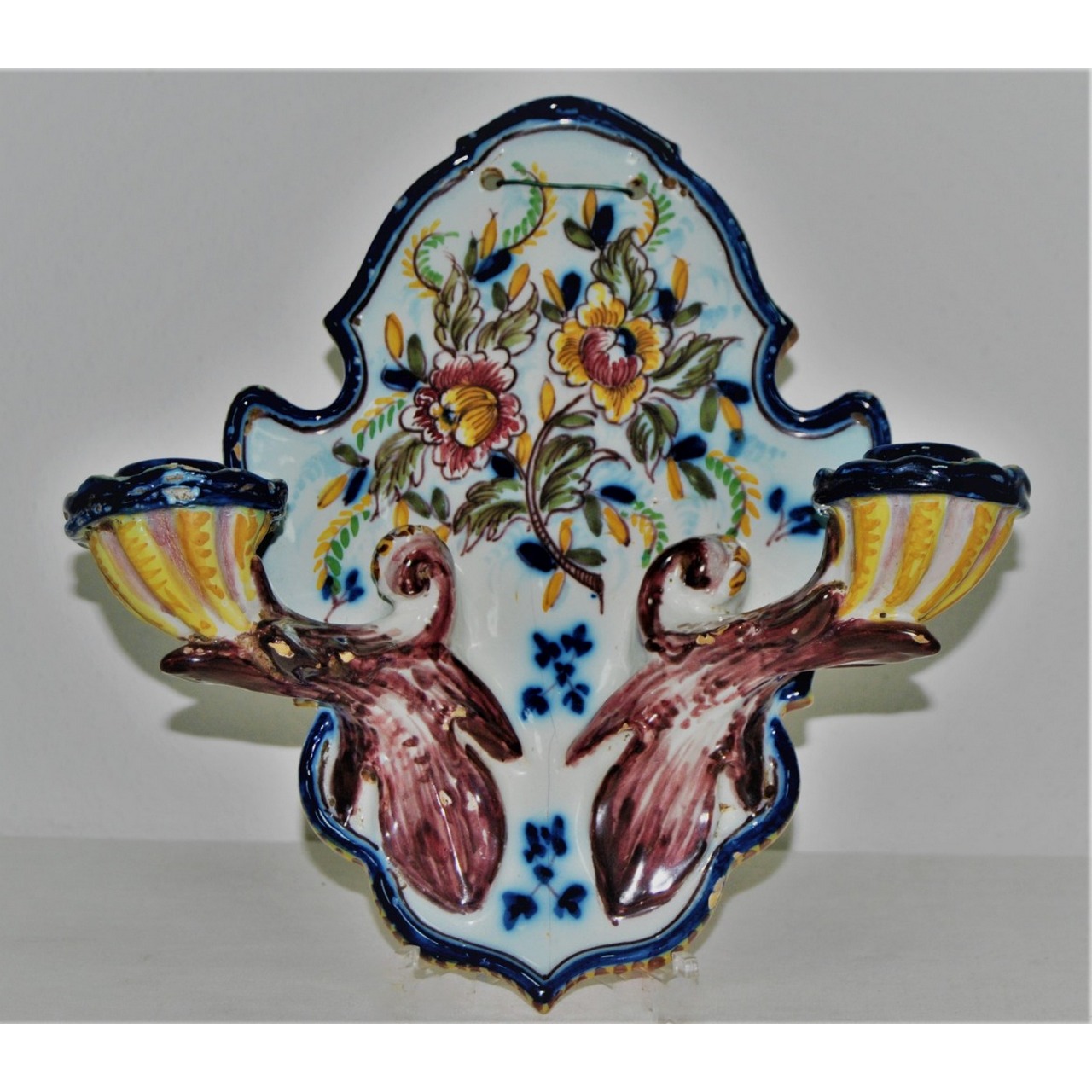 Aplique de parede com 2 lumes em cerâmica vidrada de Alcobaça, decoração relevada com motivos florais pintados à mão em tons policromos. Assinado Tanna, 1944, MP-672. Fabrico português, século XX.