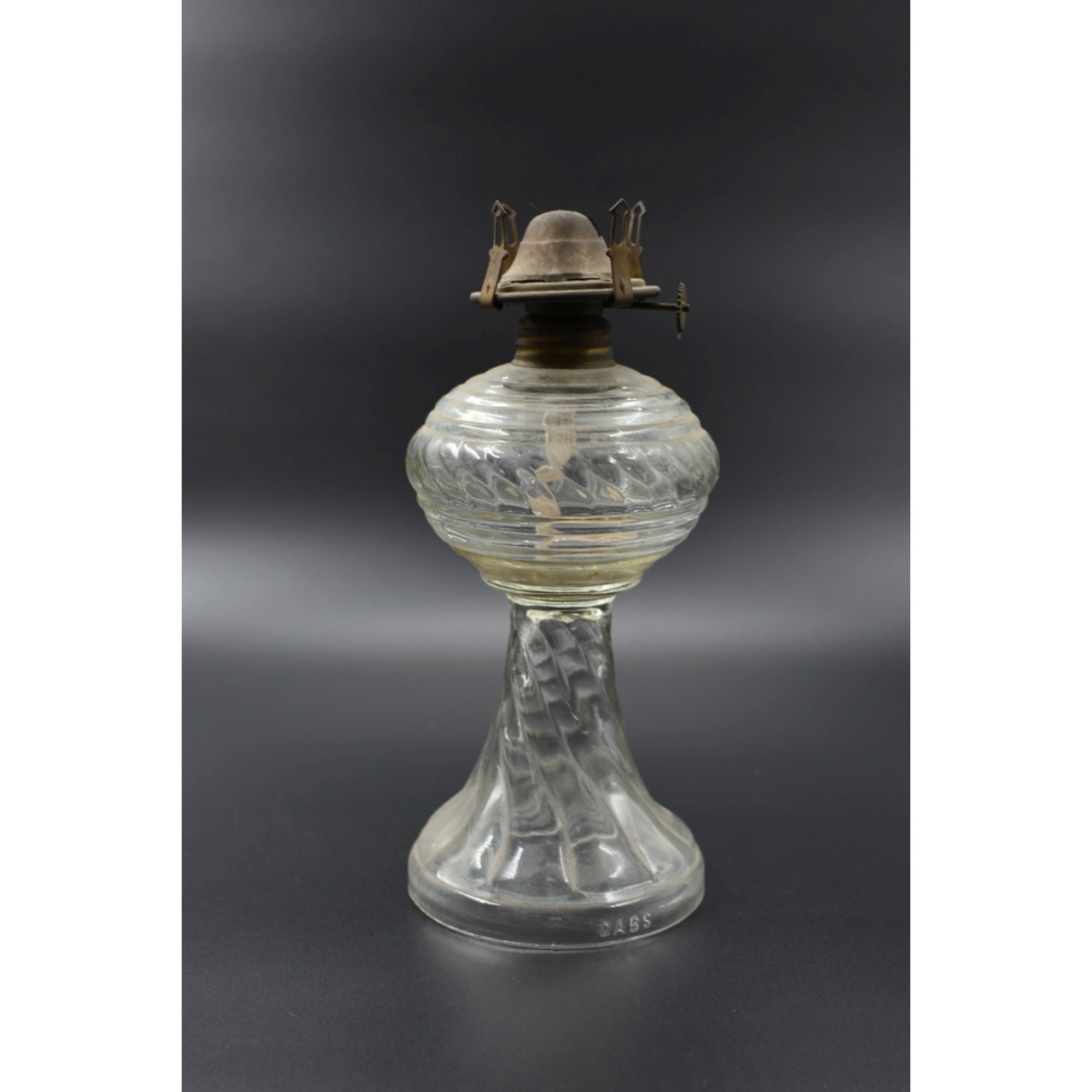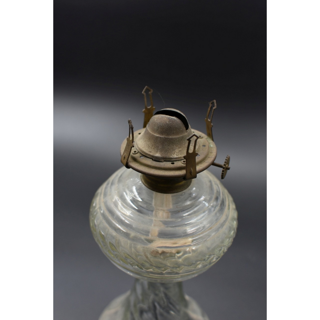 Candeeiro a petróleo vintage em metal sem chaminé e globo com sinais de uso.