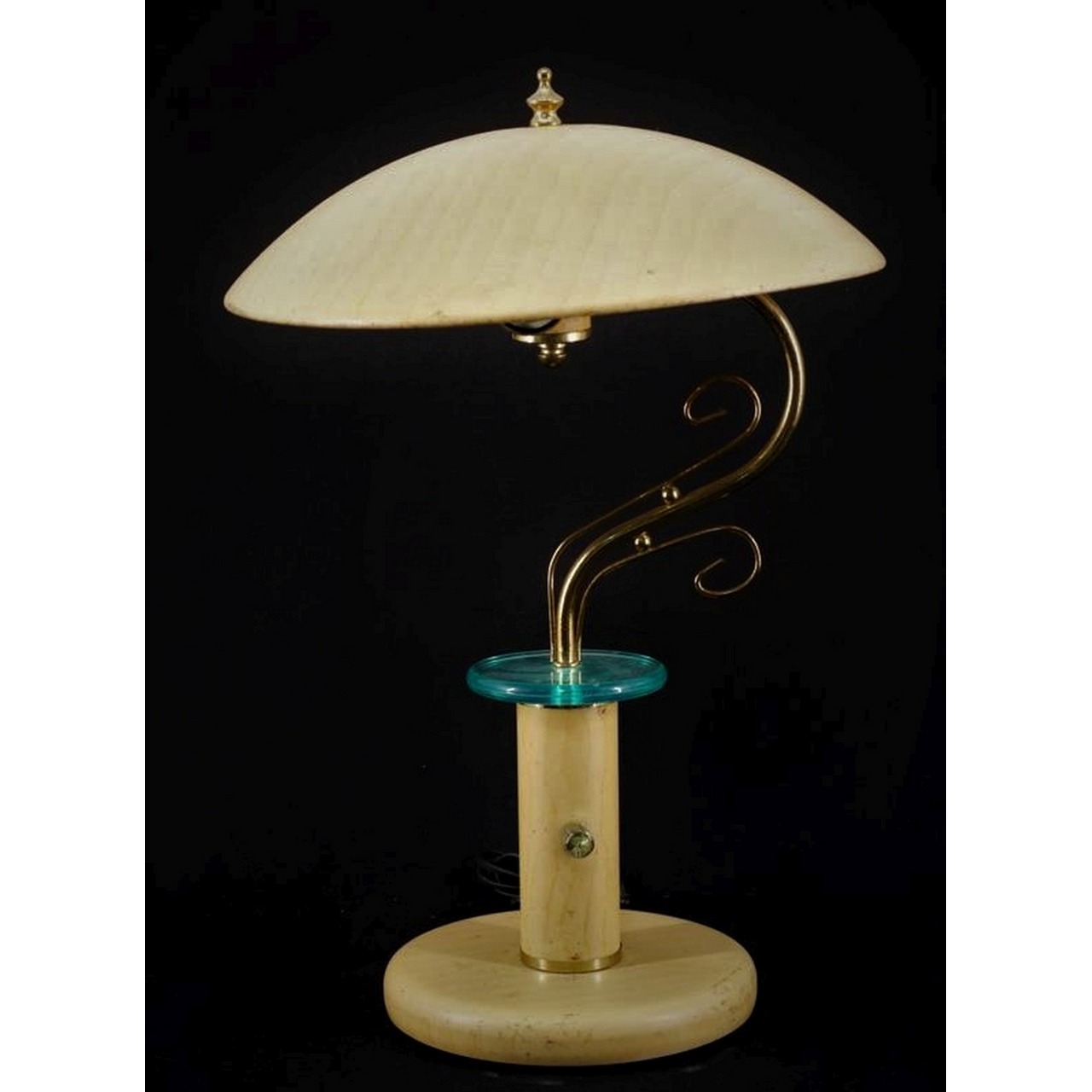 Elegante candeeiro de mesa Banker de estilo pós-moderno, produzido em metal pintado a imitar madeira (tortoise swirl), com delicadas aplicações em latão dourado e disco intermédio em vidro verde-água translúcido.