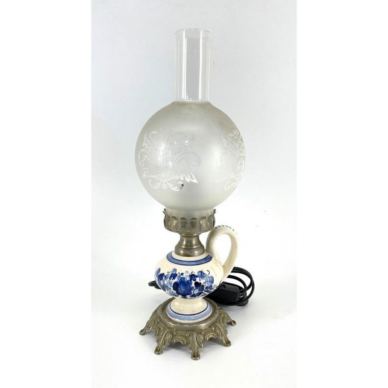 Pequeno candeeiro de mesa simulando candeeiro a petróleo antigo em cerâmica, decorada com motivos florais pintados à mão em tons de azul sobre fundo branco. Assente em base de metal prateado. Globo em vidro fosco e chaminé translucida. Electrificado.