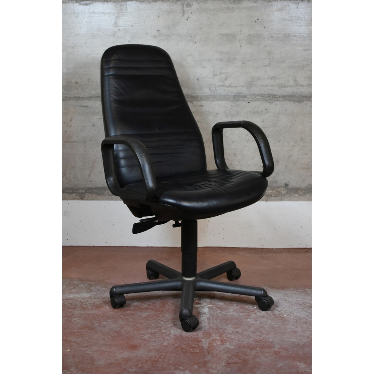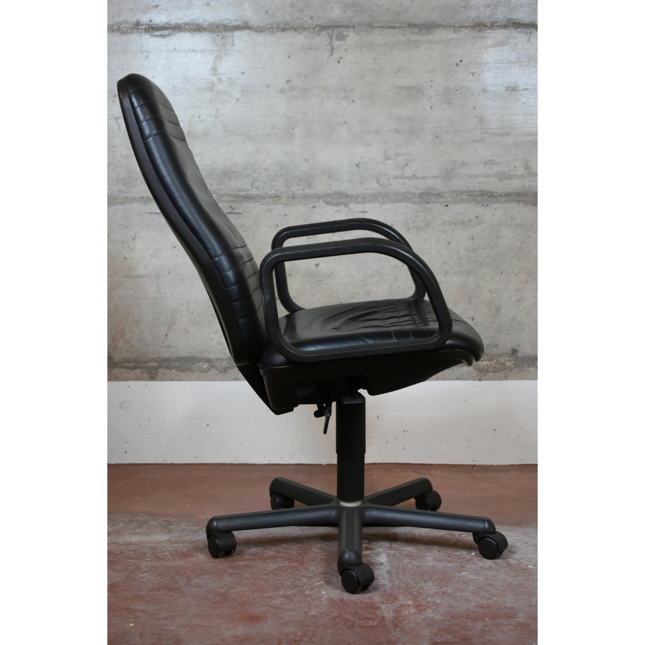 Cadeira de escritório com rodas rotativa estufada em pele preta e estrututa em metal e plástico preto. Sinais de uso.