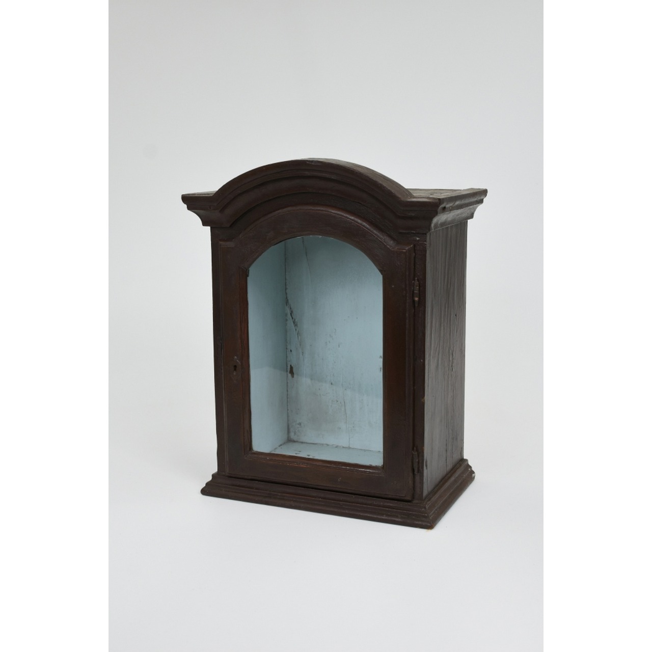 Oratório em madeira com porta em vidro, pintado a azul no interior