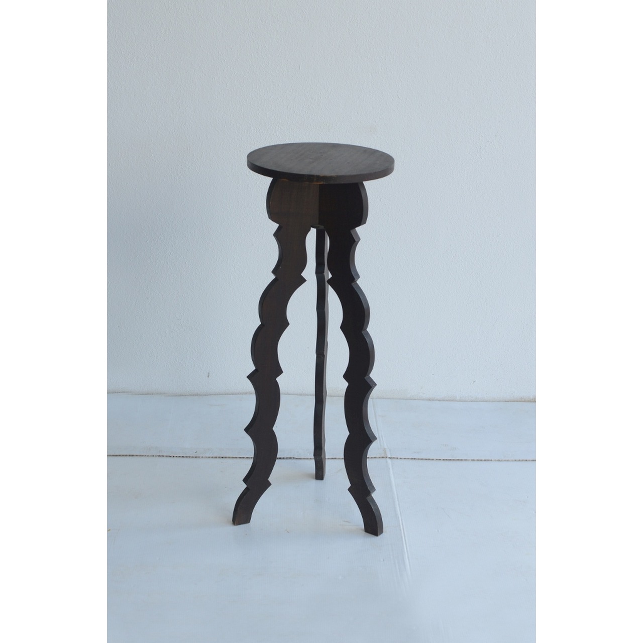 Pequena floreira vintage em madeira, com tampo circular e base com decoração recortada. Século XX