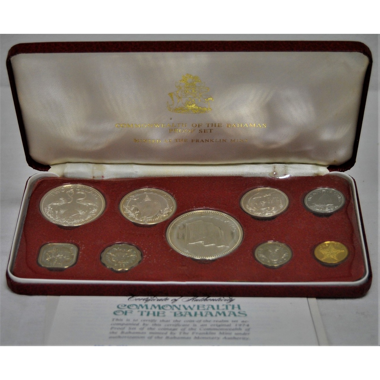 Moedas de Commonwealth das Bahamas, 1974, Coleção de 9 moedas diversas. Conjunto proof. Com indicação "Franklin Mint". Origem: Bahamas, 1974.