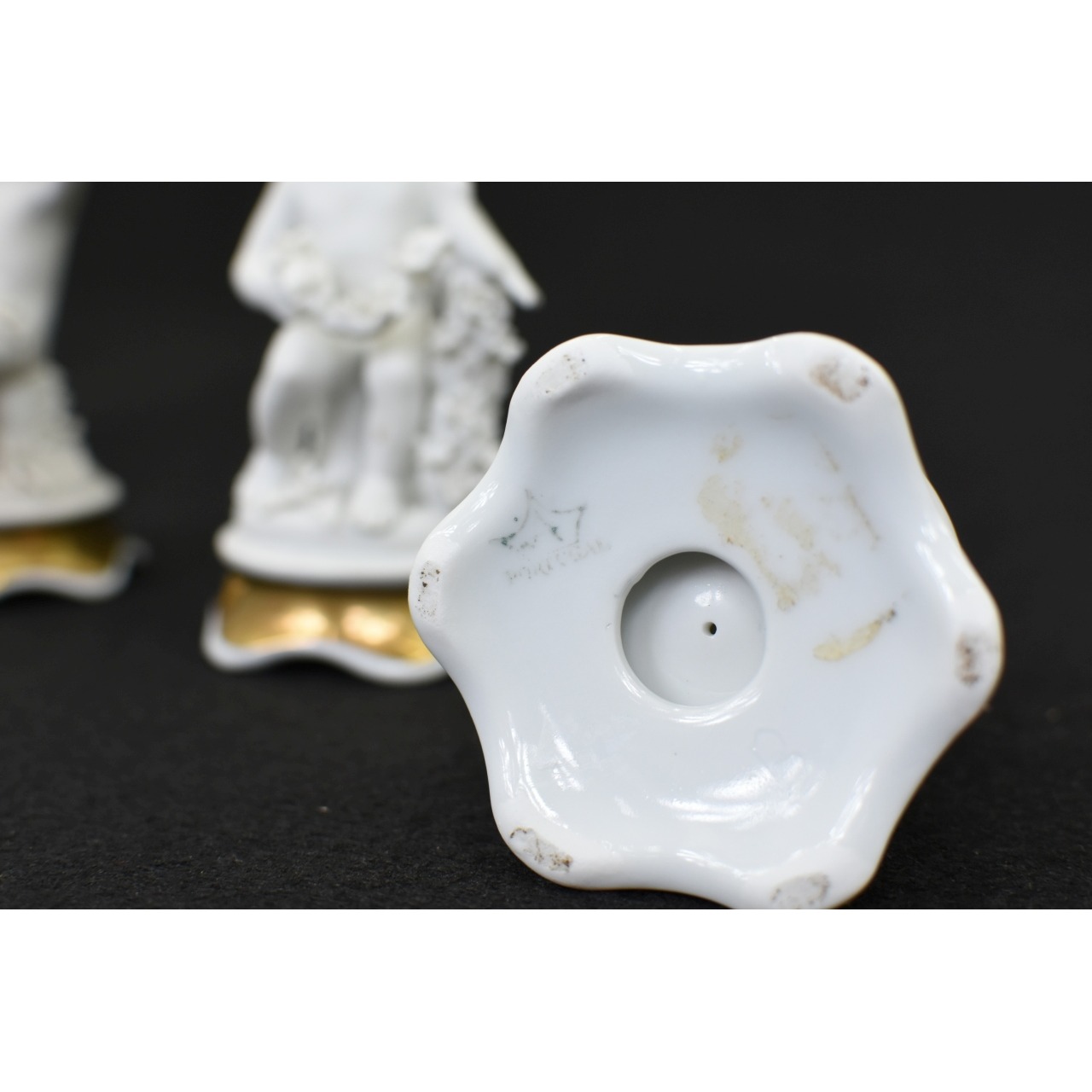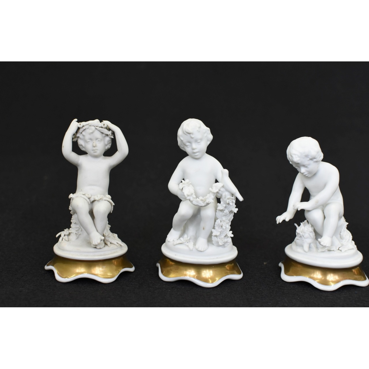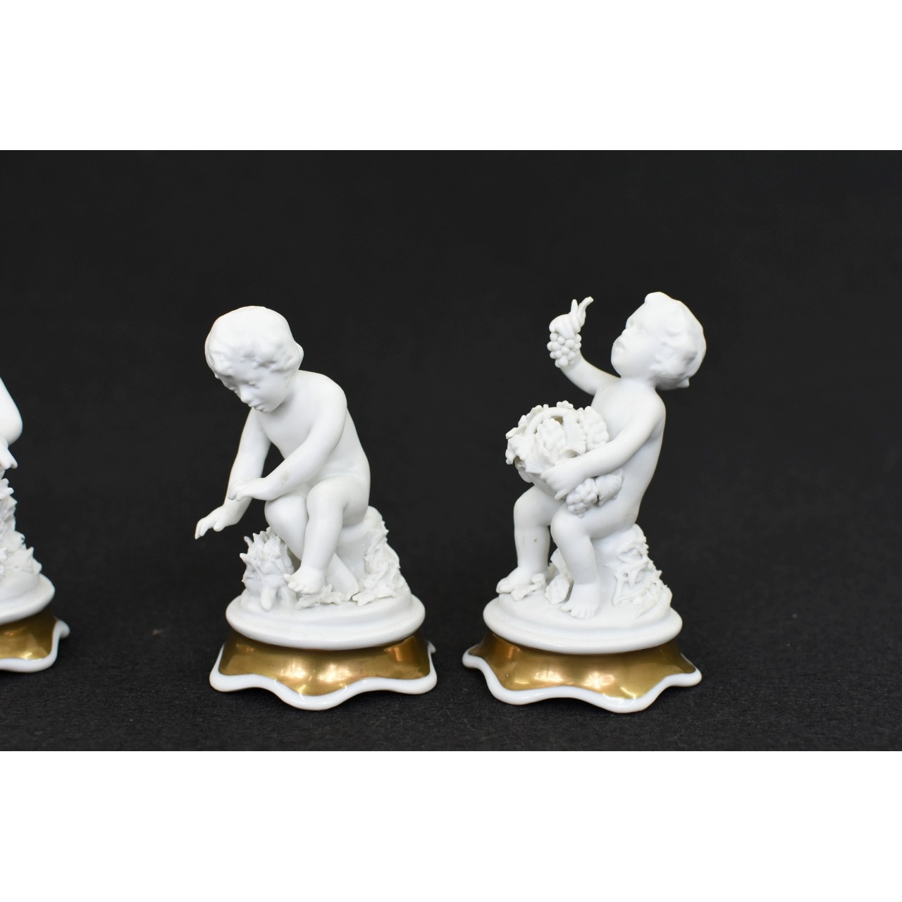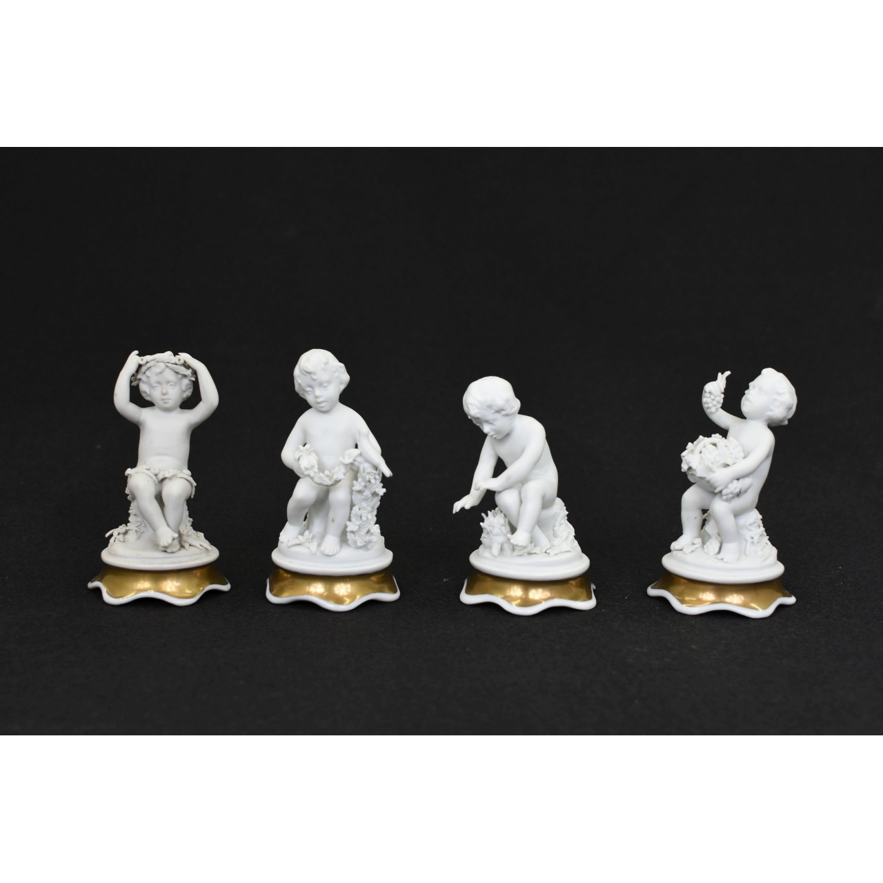 "Conjunto de 4 querubins, esculturas em biscuit, com base pintada em tons de dourado. Marcado Artibus, Fábrica de Aveiro, Portugal. Século XX. "