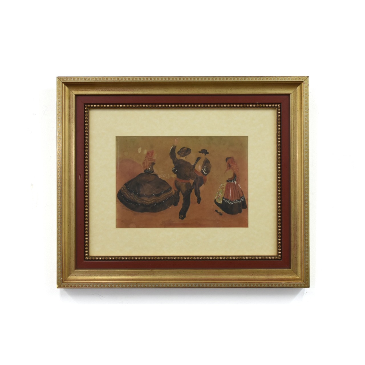 Aguarela sobre papel com tema "Fandango" - estudo atribuido a José Malhoa com moldura dourada
