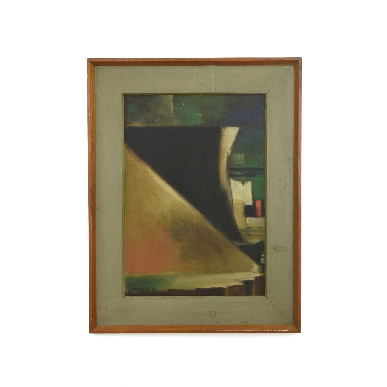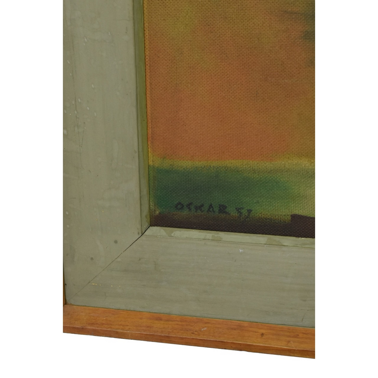 Óleo sobre platex com tema "Casario" assinado Oscar (Oscar Pinto Lobo). No verso Guache sobre papel tema "Composiçao Geometrica"assinado Gustavo Fontoura. Com moldura