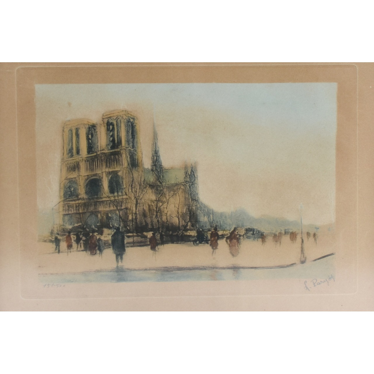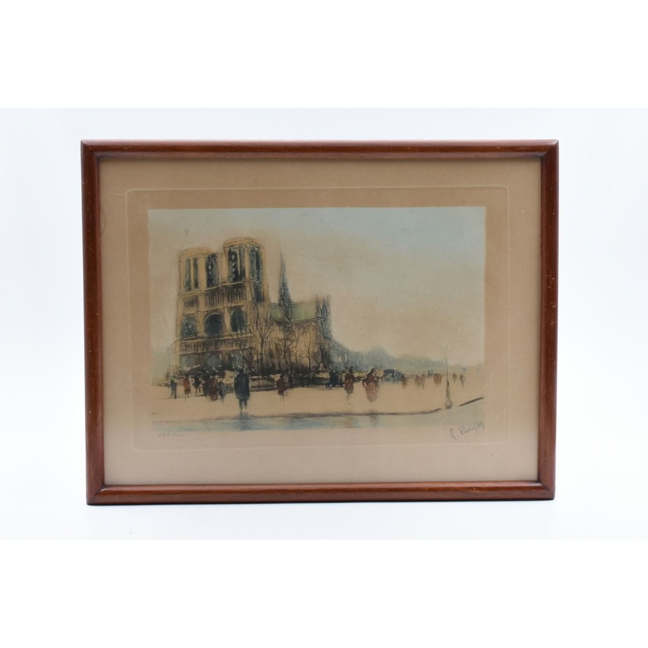 Serigrafia de aguarela com tinta da china (151-500) tema"Notre-Dame com figuras" assinado L . Paryos. Com moldura