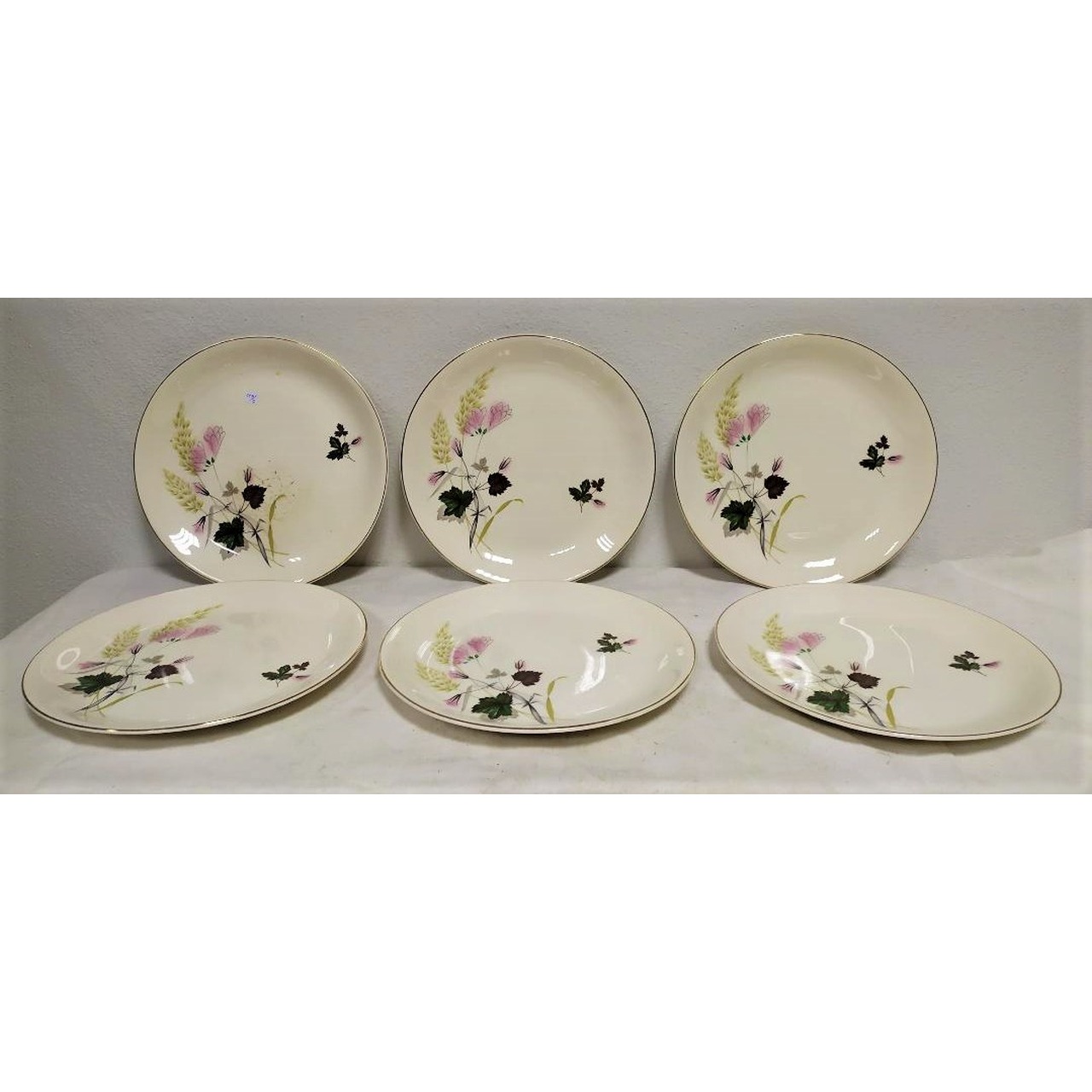 Conjunto de 6 pratos em faiança inglesa, com decoração floral estampada por decalque em tons policromos. Marcado "Alfred Meakin, England". Coleção Pampas. Início do século XX.