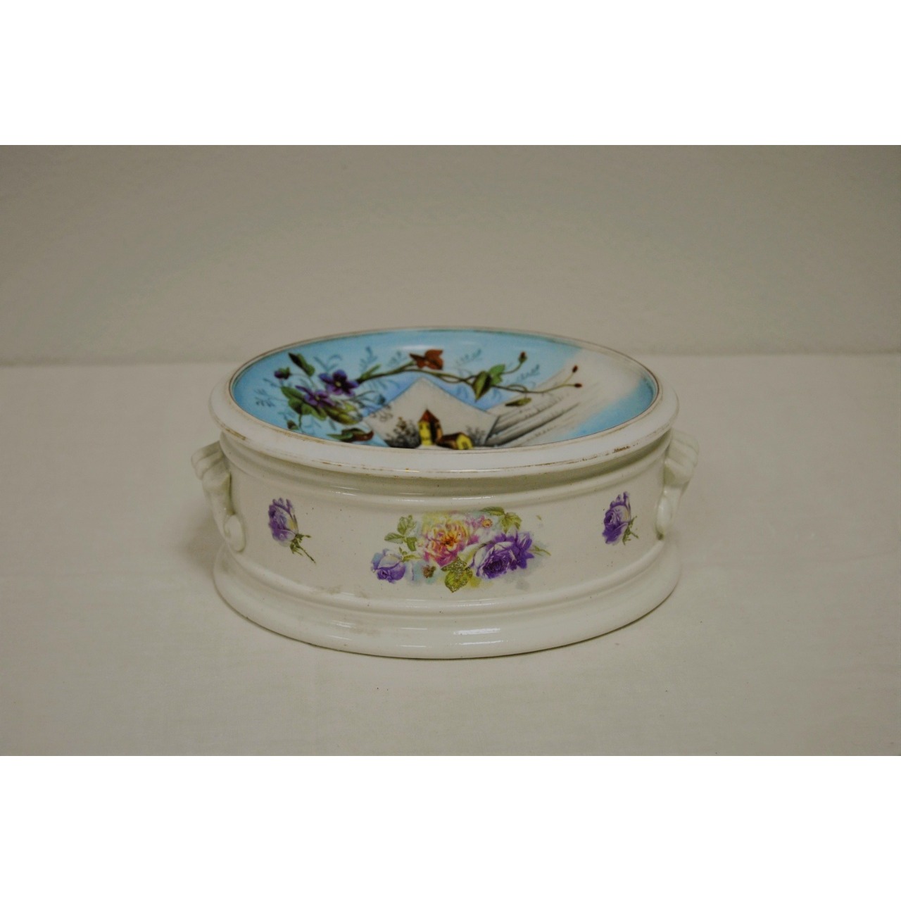 Escarradeira com tampa em porcelana europeia, decorada com motivos florais e paisagem pintados à mão, com filete dourado no bordo. A base parece ser de cerâmica vidrada com motivos florais policromos estampados por decalque. Sem marcas.