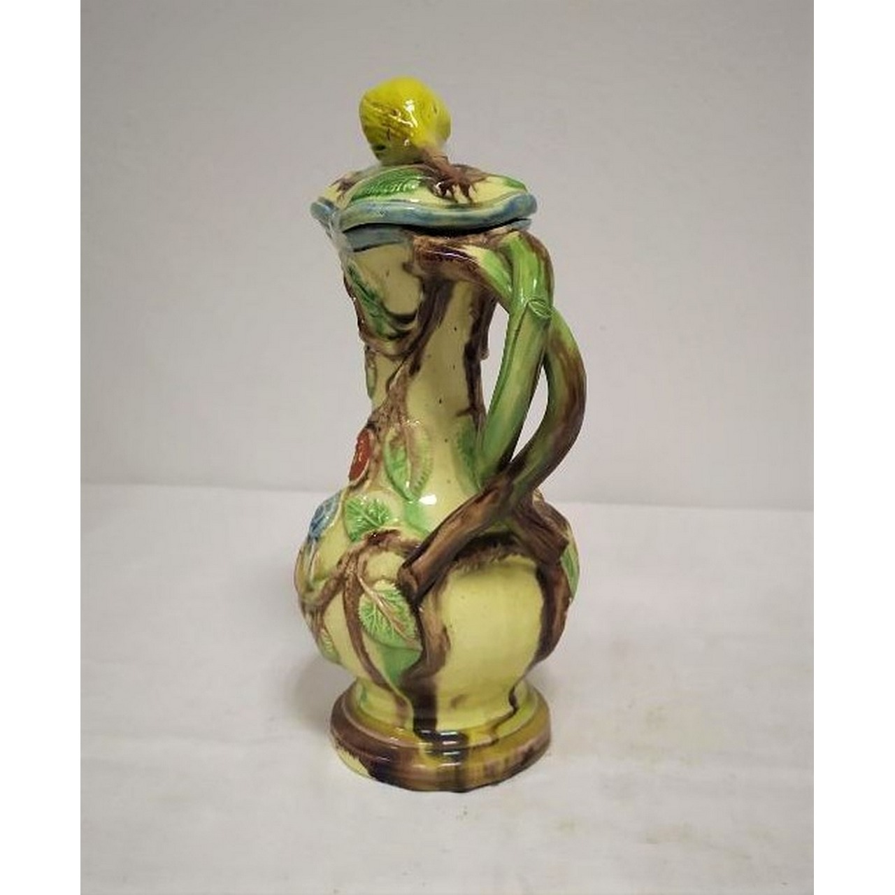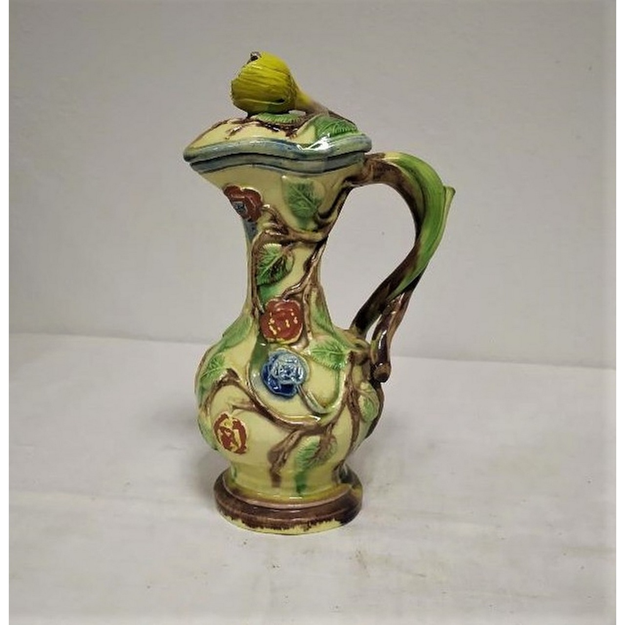 Jarro com tampa em faiança portuguesa das Caldas da Rainha. Pintado à mão em tons policromos e com motivos florais relevados. Séculos XIX/XX.