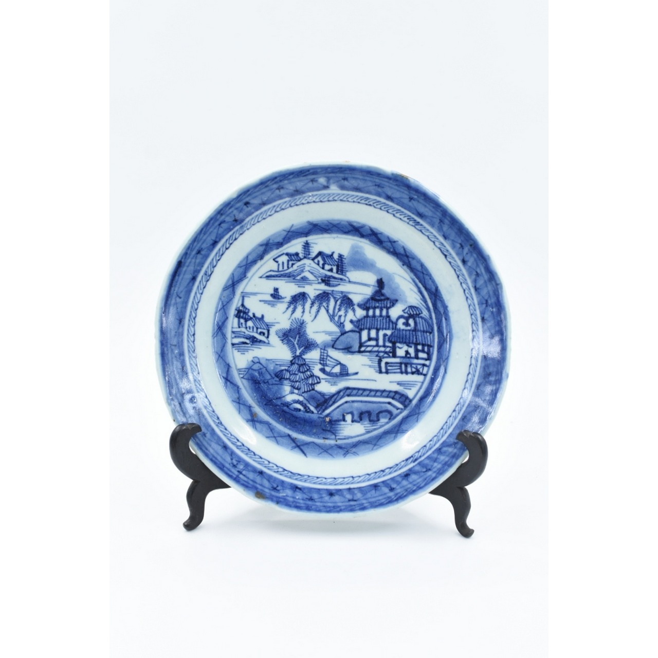 Prato raso de porcelana chinesa de exportação, decoração a azul "Cantão", sec. XVIII