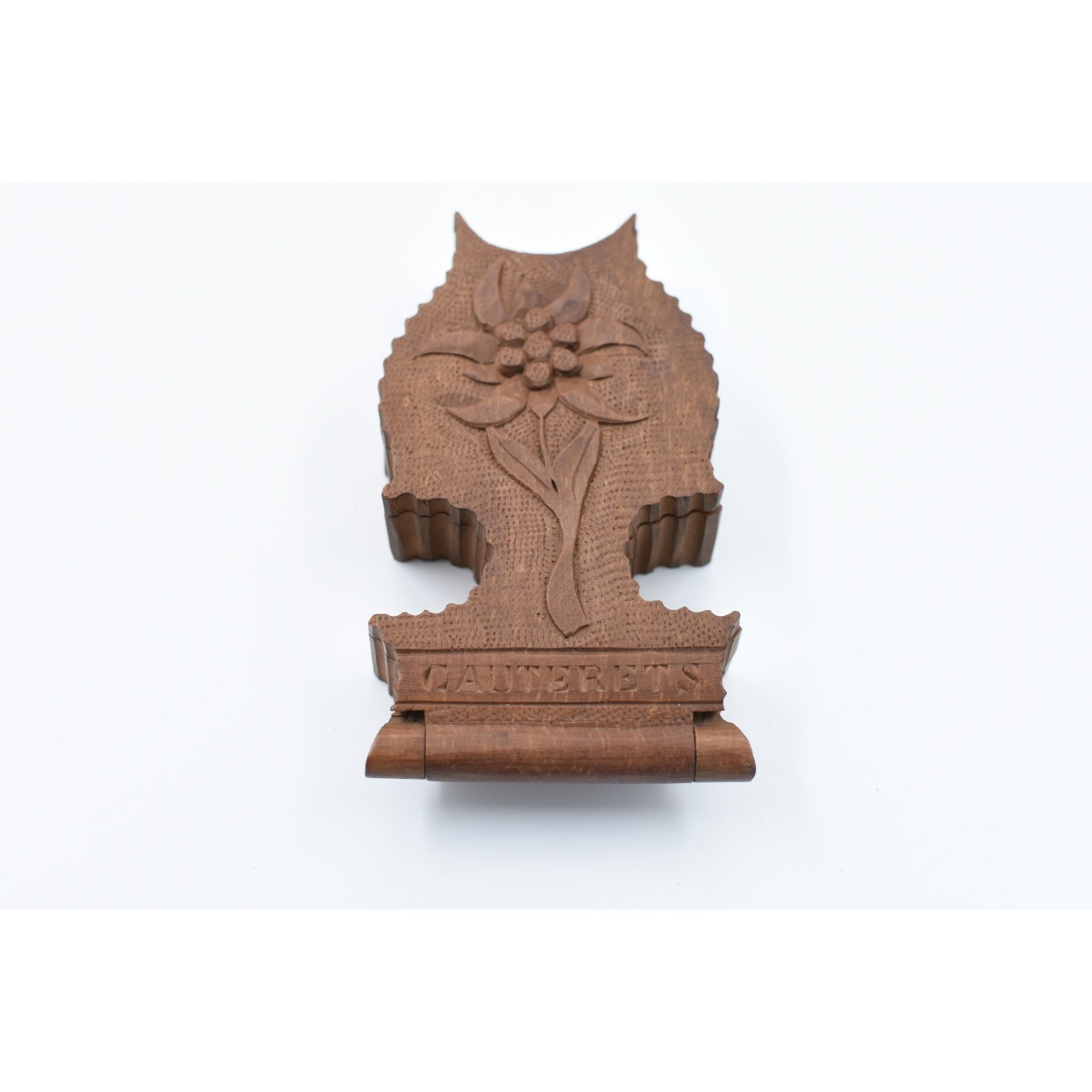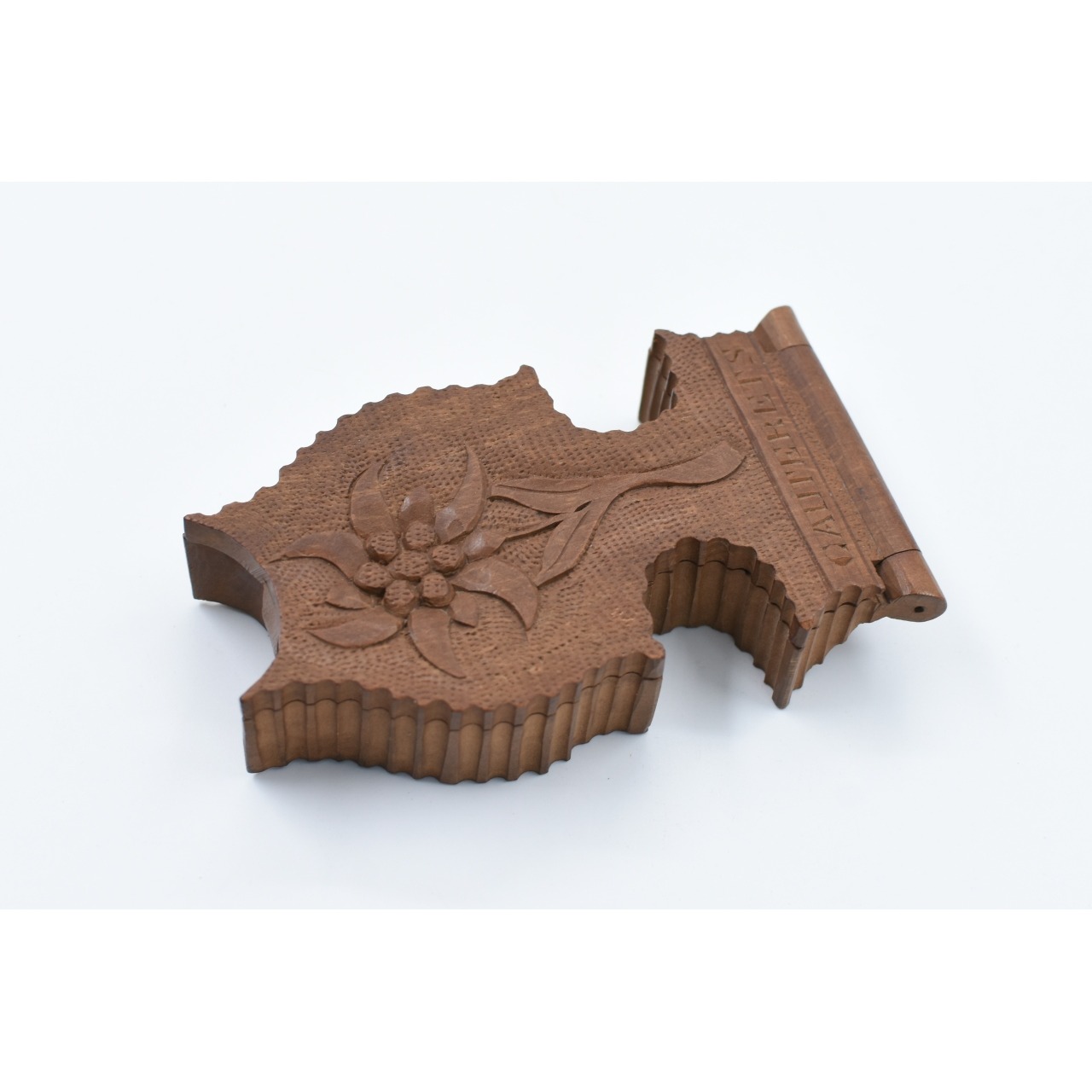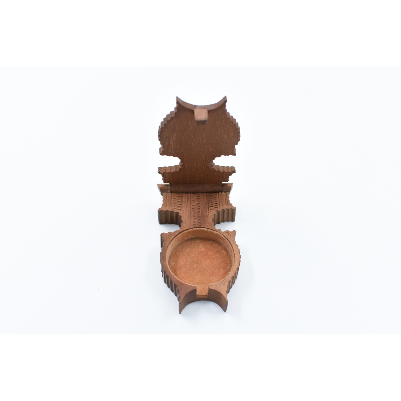 Caixa expositora para relógio de bolso em madeira gravada e relevada.