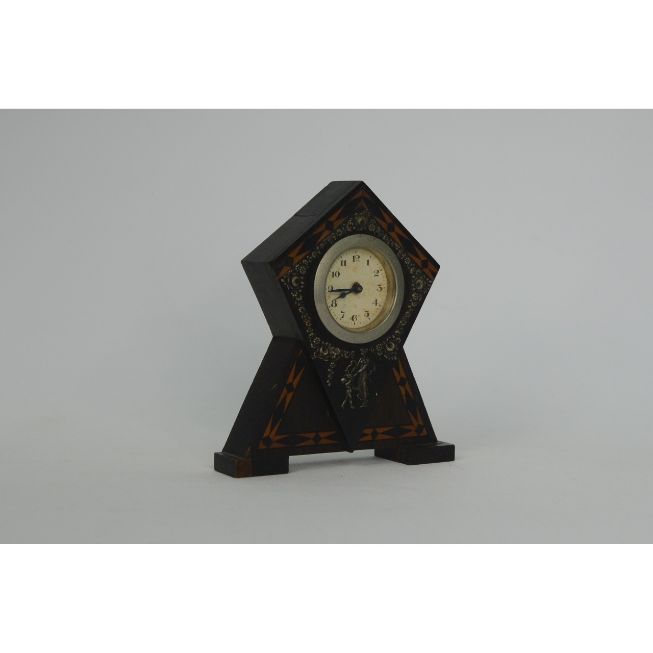 Relógio de mesa em madeira, com decorações embutidas em madeira mais clara, com motivos florais e figuras clássicas em metal prateado. Mostrador com númeração árabe. Não está a trabalhar, precisa de revisão.