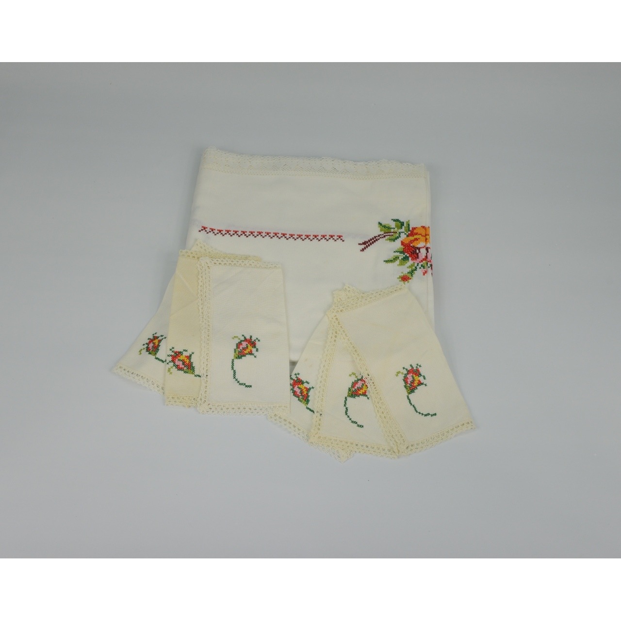 Toalha de mesa quadradaem tecido, decorada com rosas bordadas à mão a ponto-cruz. Inclui 6 guardanapos. Século XX